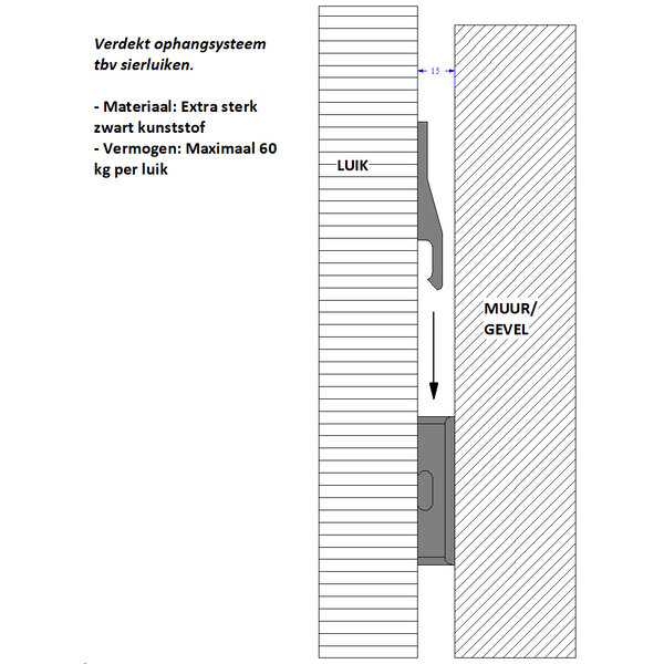 Verdekte ophanging sierluiken tbv het vast monteren van de luiken aan de gevel.